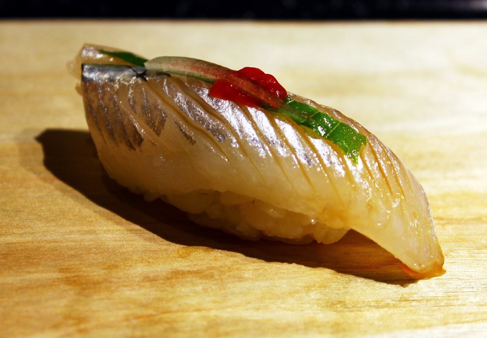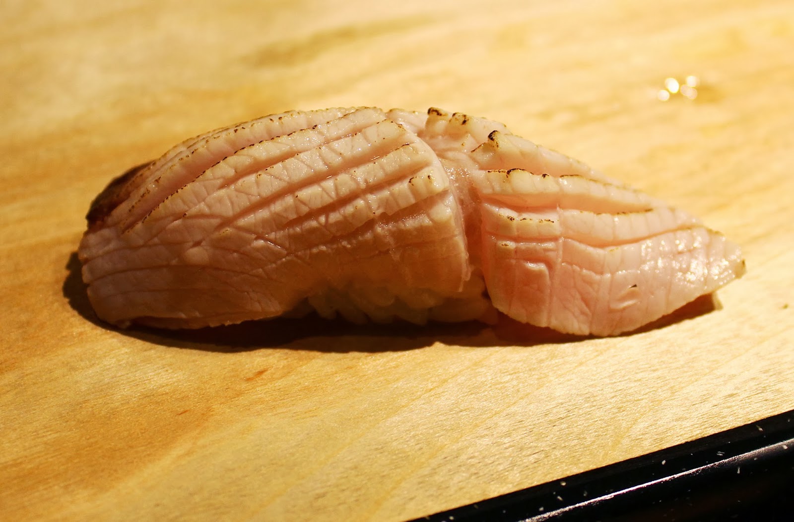 白魽在日本料理中素有「白肉魚之王」的美譽,這貫壽司沒有多餘的佐料,師傅僅用簡單的調味與刀工讓客人直接品嚐其原味與富彈性的肉質。